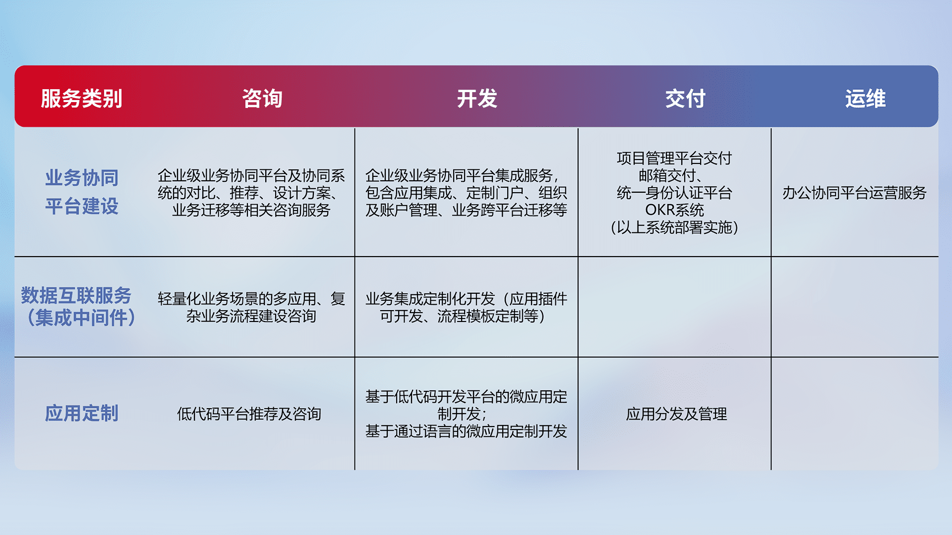 针对钉钉、、企微、、、IDaas等平台级产品提供产品的规划、、方案、、交付、、定制化开发等服务,,,,实现如统一协同办公、、智能客户服务、、、、混合会议管理、、智能数据查询、、等业务场景,,,,实现数字化转型。。。。